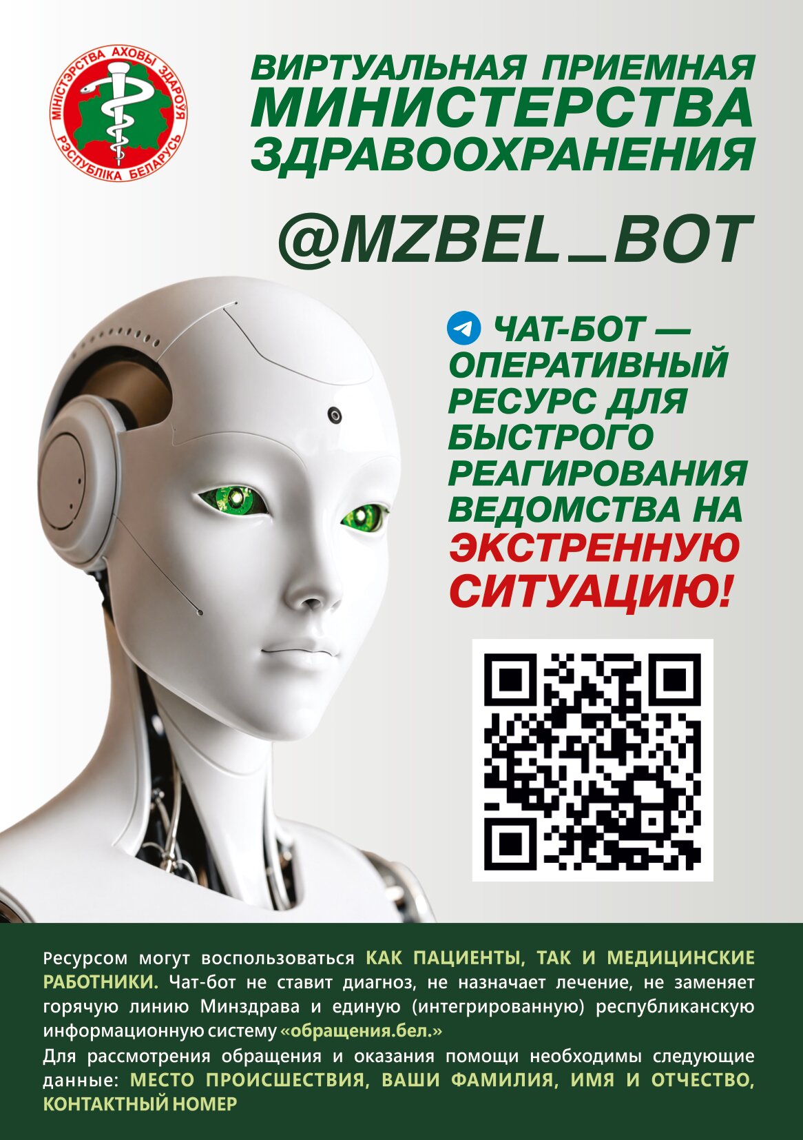 Этот чат-бот не ставит диагноз и не назначает лечение, данный чат не заменяет горячую линию Минздрава и единую (интегрированную) республиканскую информационную систему учета и обработки обращений граждан и юридических лиц обращения.бел.